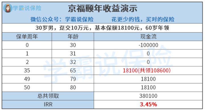 作为一款养老年金,京福颐年的表现是不错的。30岁男趸交10万,60周岁开始领,领到80岁能领到380100元,IRR收益率达到了3.45%。