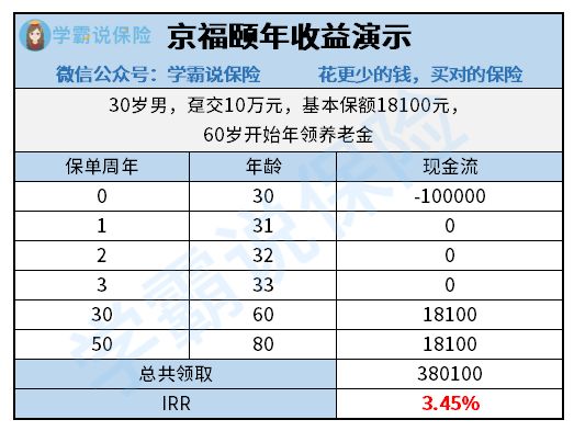 可以看到京福颐年20年大概能领到38万元,除去10万保费,收益大概为28万,irr为3.45%。而市面上大多的年金险其年化利率大概能达到3%以上,京福颐年这收益率看起来还比较可观。
