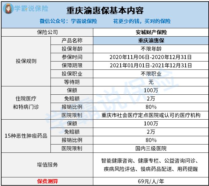 通过上面的分析,我们了解了重庆渝惠保只能起到补充部分医保空白的作用,不过胜在它投保门槛非常低且便宜,比较适合老人和高危职业人群做补充。
