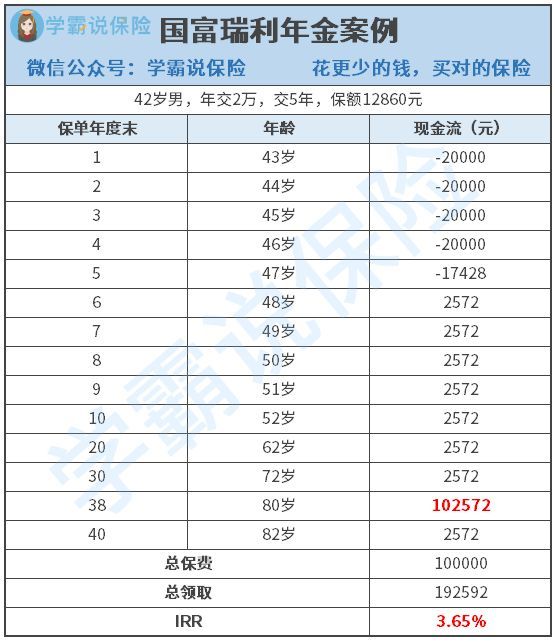 学姐以42岁老李,年交2万,交5年,保额为12860元为例,请看国富瑞利年金险的收益演算图: