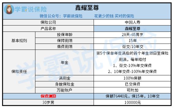 从上面的保障图中,我们可以明显地看到,鑫耀至尊年金险的投保年龄为28天-65周岁,保障期限只有15年,缴费期限有趸交和10年交两种方式。