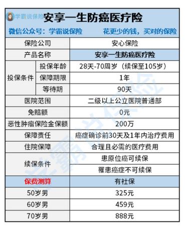 从上面的保障图看来,安享一生防癌医疗险投保年龄为出生起28天至70周岁,等待期90天,恶性肿瘤保险金最高赔付200万保额,免赔额为0,除此之外,还包括了住院保障。