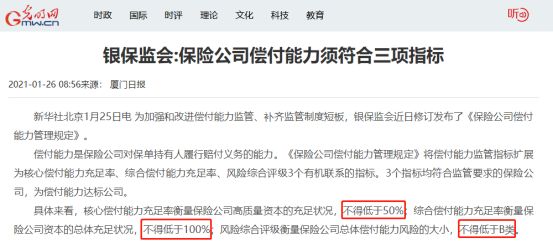 银保监会明确规定保险公司偿付能力需要同时符合三项指标:一是核心偿付能力充足率不低于50%;二是综合偿付能力充足率不低于100%;三是风险综合评级在B类及以上。