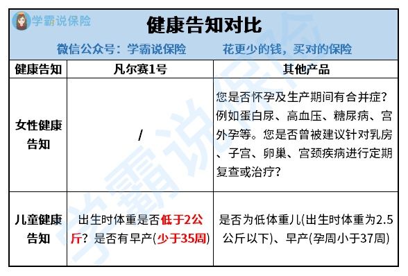 大多数的重疾险产品对女性都会有类似是否曾经宫外孕、妊娠高血压等健康告知询问,而凡尔赛1号是没有这类询问的,如果是曾经宫外孕、妊娠高血压等情况的女性群体可以大胆投保哦,对女性非常友好。并且对于儿童也是比较友好的,早产孕周时间和早产导致的婴儿体重过轻情况,凡尔赛1号都是相对宽松的。