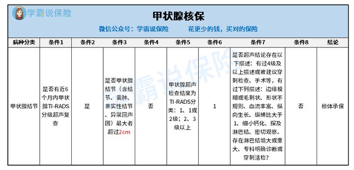 TI-RADS分级为1级或2级,结节最大直径不超过2cm,且没有淋巴结增大、形状不规则等不利描述,可以正常承保,这个相对于大部分重疾产品来说是比较不错的。
