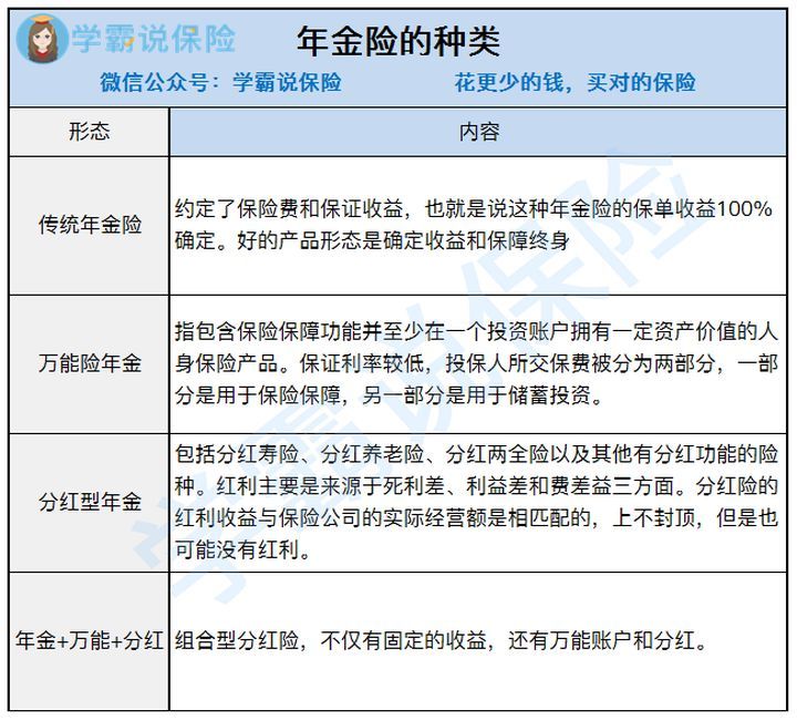 而年金险也分为传统型年金险、万能险年金、分红型年金险和组合型年金险,具体区别请看下图: