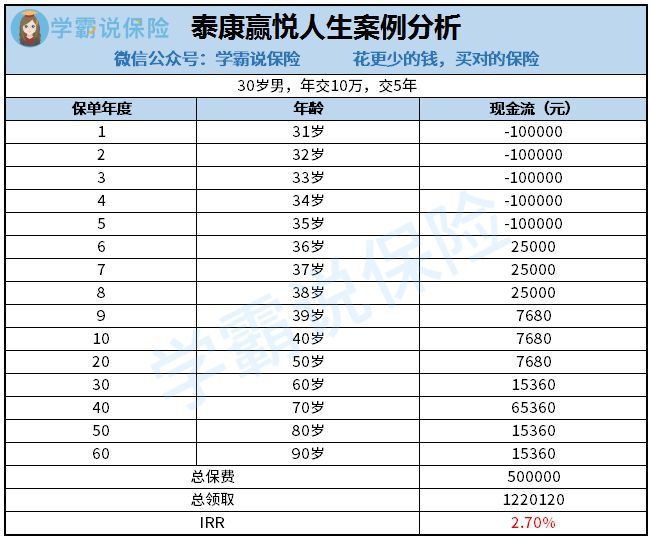 学姐就以30岁老王,10万,交5年为例,看看泰康赢悦人生年金险的收益: