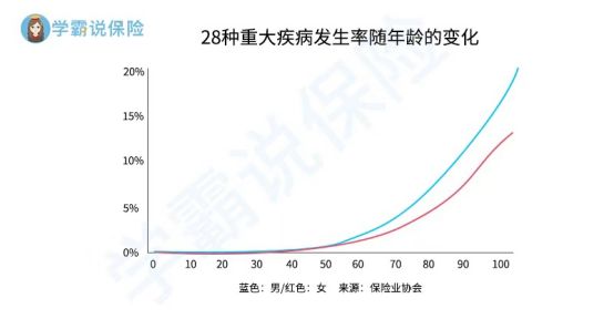 大家可以从图中清楚的看到,0-40岁重疾患病率较低;40岁以后快速增高;60岁后呈极速上升趋势。