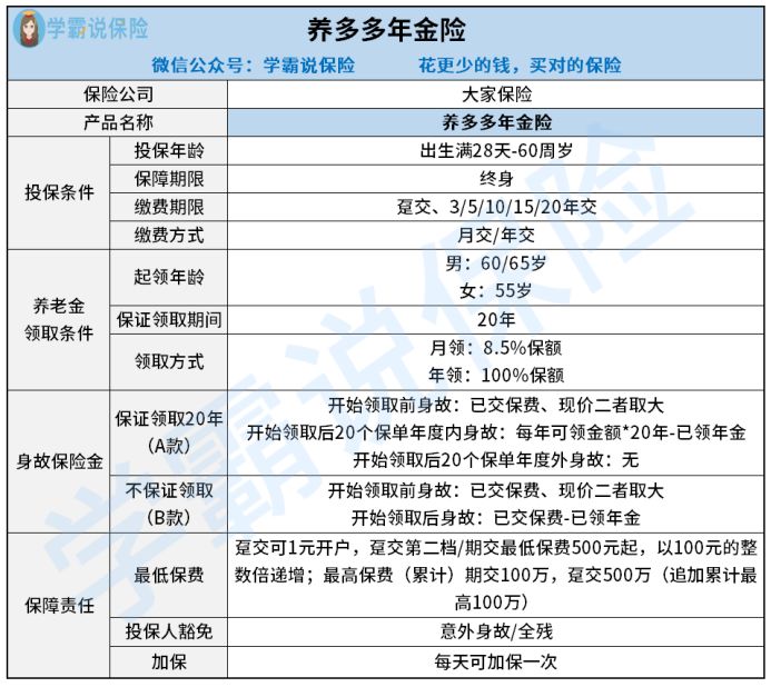 养多多年金险有保证领取20年跟不保证领取两种可选,非常灵活跟人性化。学姐比较推荐大伙选择保证领取20年的版本,这样就能保证拿到20年的稳固收益。