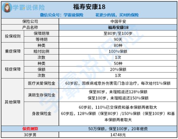 (3)价格较高:30岁男性买50万保额、保至100岁的福寿安康18,分20年缴费的情况下,每年需要14748元的保费。这样的价格,完全可以买到保障更全面的保险产品。
