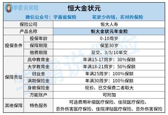 恒大金状元年金保险是专门为出生满30天-10周岁的人群量身打造的产品。投保门槛稍微比较高,且保障期限只保到30周岁,适合想要给孩子短期投资的父母们购买,尽早配置可以提前规划。