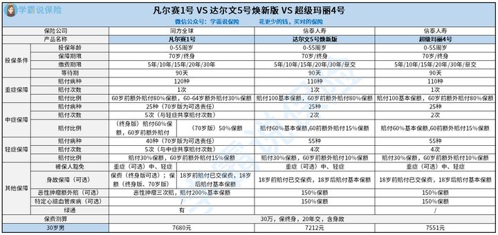 同样是30万保额,保至终身,分20年,达尔文5号焕新版的保费相对于其他两款是最低的,保障也比较全面,适合预算偏低一点的人群购买。