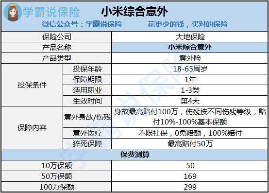 小米综合意外险保障内容很简单,包括了意外身故/伤残、意外医疗、猝死保障。跟其他产品相比,最大的亮点就是总体保额比较高,不限社保并且100%报销。