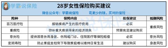 28岁女性买哪些保险合适?学姐整理了一个简洁的表格,先来一起看看: