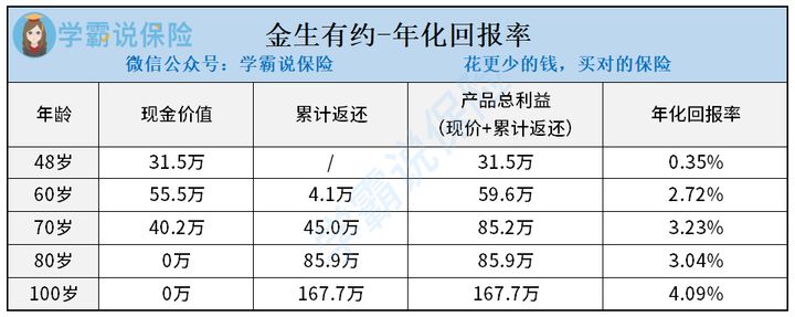 收益也不错,活得越久,收益越高,但回本速度较慢这点也需要注意,如果资金并不是很充足的朋友还需认真考虑。