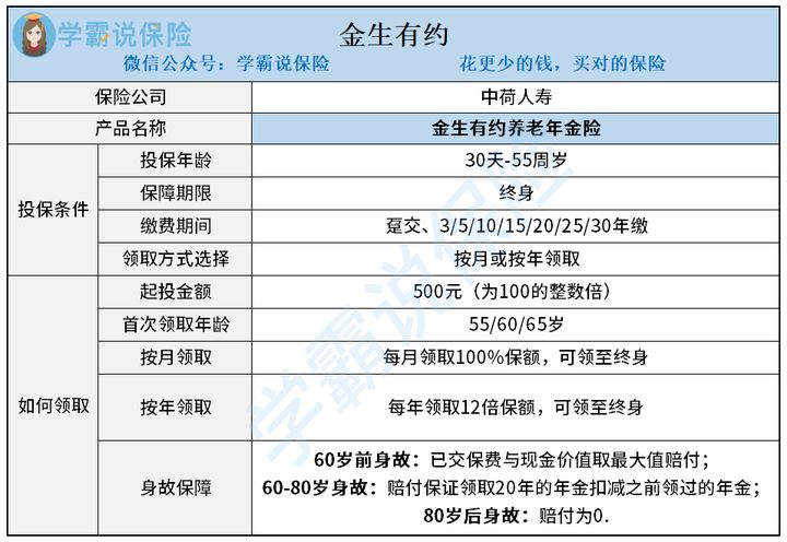 这款养老年金险最大的亮点是保证20年领取,除此之外,金生有约可以选择在55、60或者65岁时,按月或按年领取养老年金,直至终身,收益也是比较不错。