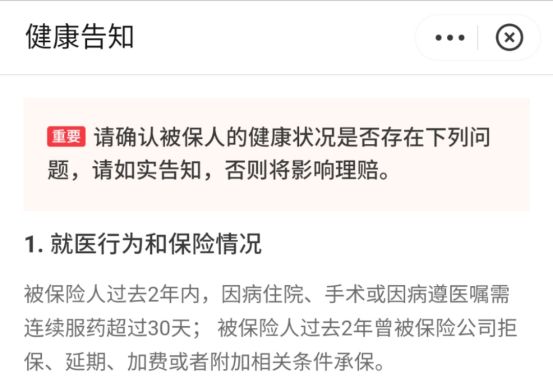 上图截自好医保长期医疗的健康告知,可以看到它询问的是过去2年内,因病住院、手术或因病遵医嘱需连续服药超过30天的;或者过去2年内曾被拒保、延期、加费或附加其他条件承保。