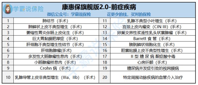 因此,前症保障是一项相当实用的保障,康惠保旗舰版2.0提供20种前症疾病保障,实属很为消费者考虑了!