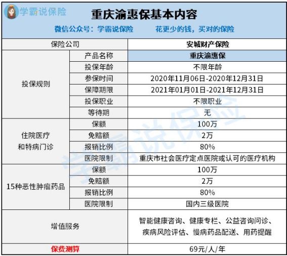 重庆渝惠保年保费才69元,也就是几杯奶茶钱,并不像其他医疗保险一样对年龄设置不同的保费,让每一个人都买得起保险,对于普通人来说确实是一件好消息。