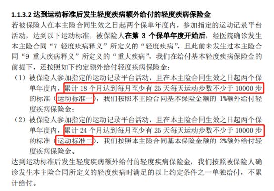 平安保险的很多产品一大特色就是有运动增加保额方案,平安福2021就有。以轻症增加保额为例,达到运动标准一就可额外增加1%保额,达到运动标准二就可额外增加2%保额。