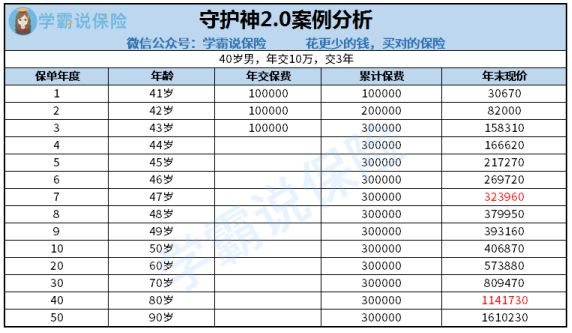 以下我以40岁老王投保爱心人寿守护神2.0,年交10万,交3年这个案例,给大家分析分析: