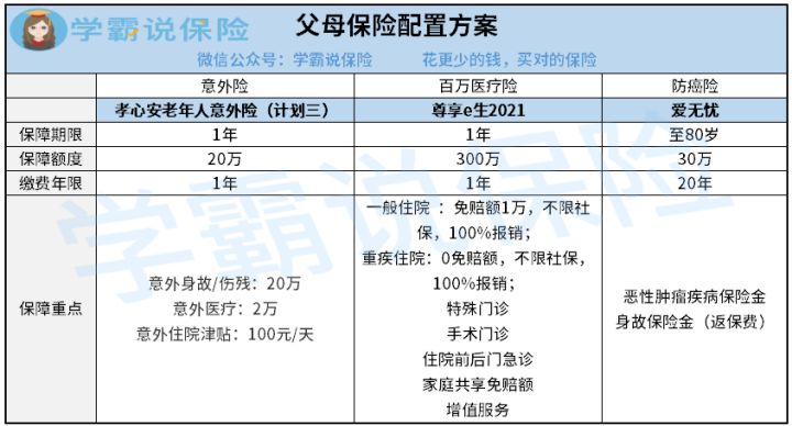 看完学姐上述分析,想必大家都已经知道怎样为父母配置保险了,接下来看看学姐为父母制定的保险配置方案吧: