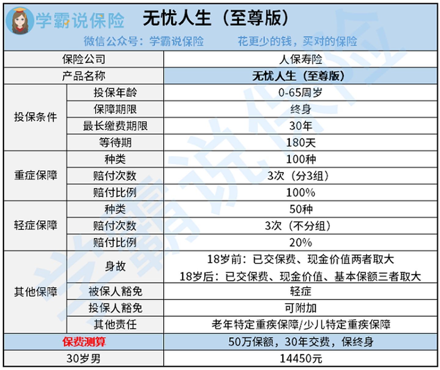这不人保寿险就推出过一款叫做无忧人生至尊版的重疾险——大病来了“心”不慌,无忧至尊来帮忙。虽然是大公司出品,到底真能能给到大家贴心保障学姐认为还有待考究。