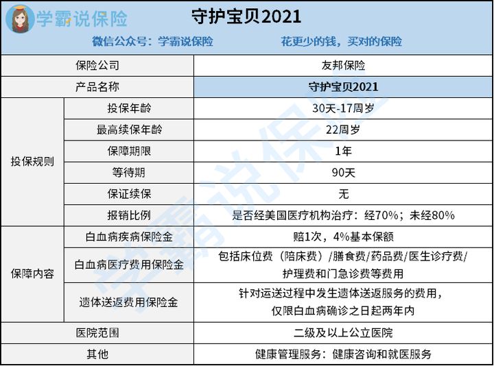 从上面的表格可以看到,友邦守护宝贝2021适合出生满30天至17周岁的孩子投保,保障内容都是对白血病方面的保障,除此以外还有健康管理服务。