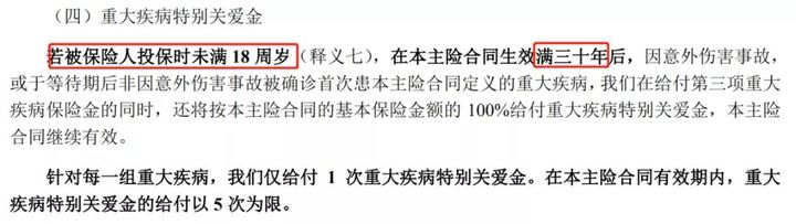 如果投保时被保人未满18周岁且合同生效满30年的话,可获得100%基本保额赔付,次数高达5次!