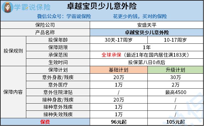一、卓越宝贝少儿意外险保障内容有什么优缺点?老规矩,先来看看这款产品的保障内容怎么样: