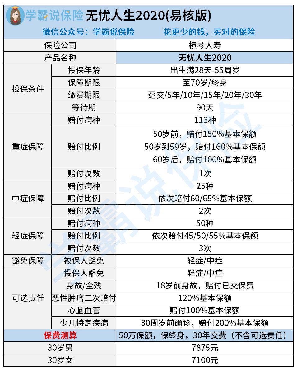 无忧人生2020保障还是非常不错的,但是核保有些严格。因此,在1月31日无忧人生2020退市前,横琴人寿放宽了核保条件,推出了无忧人生2020易核版。