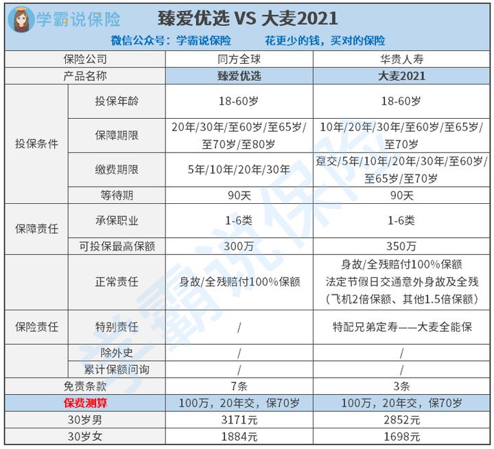 二、同方「臻爱」优选定期寿险怎么样?有什么亮点?同方全球「臻爱」优选定期寿险和大麦定期寿险一对比,可得下面的结果;