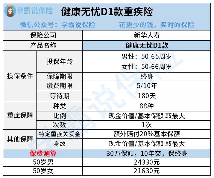 这不新华保险最近就推出了一款专门针对老年人设计的健康无忧D1重疾险,大公司出品俘获了多少人的欢心,但学姐真的奉劝大家不要太着急,买保险要是只挑大公司就好学姐不就丢饭碗了吗?要想买到真正划算的重疾险可是有技巧的~