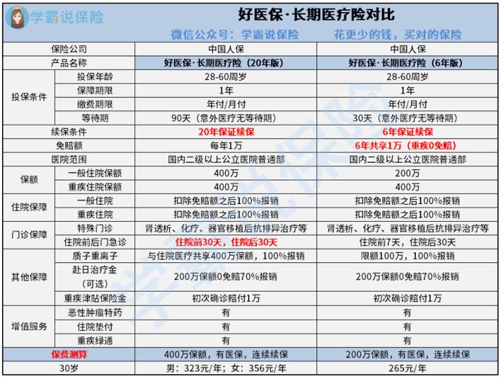 两款产品保障内容很类似,看重免赔额的可以选择6年版本的;要是想要长久的医疗保障,那就选择20年版本的更实在。