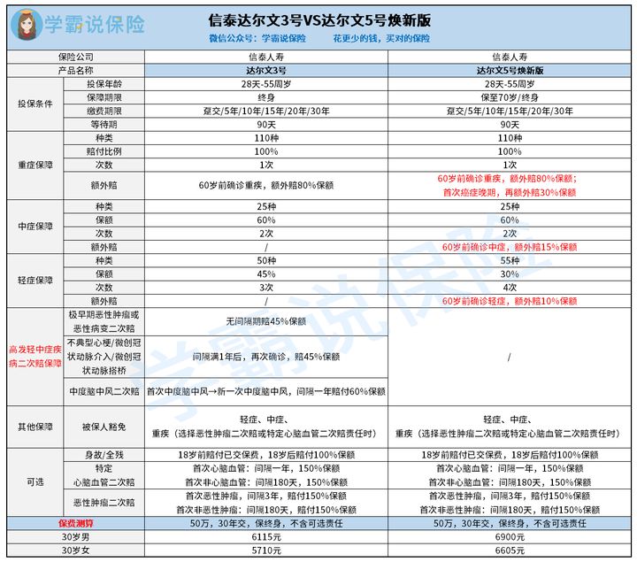 不过在重疾险新规颁布后达尔文3号已经下架,买不到的朋友也不用担心,信泰人寿又出了一款新品——达尔文5号焕新版!今天学姐就对比分析达尔文3号和达尔文5号焕新版这两款重疾险,评价一下它们的具体保障怎么样?