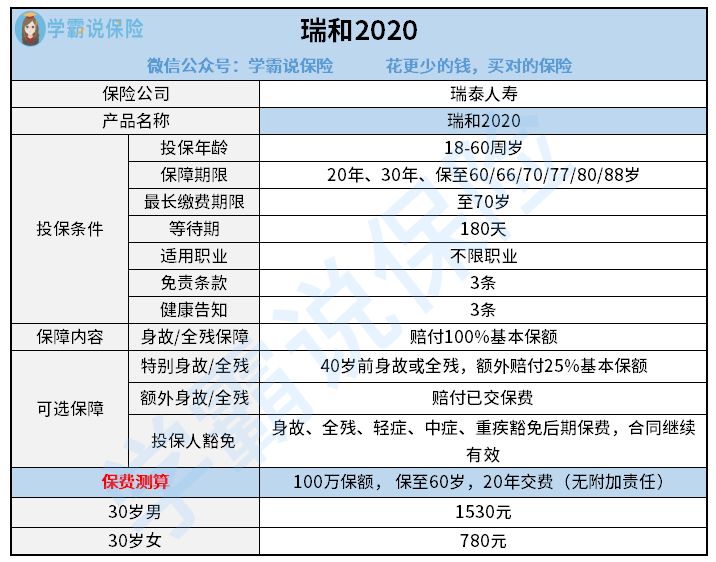 瑞和2020的价格整体上看的比较便宜的,100万保额,保至60岁,20年缴费,30岁男性一年只要1530元,而女性则只需要780元 ,便宜了一半左右,女性在费率上优势很大。