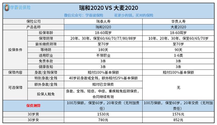 在适用职业上,瑞和2020是不限职业,大麦2020是1-6类职业,相比之下,瑞和2020覆盖人群更广。