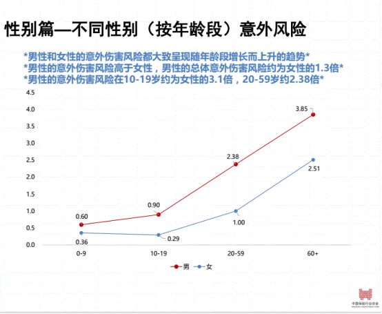 根据中国保险业协会的统计数据显示,意外风险会随着年龄段的增长而呈上升趋势,并且男性的意外伤害风险高于女性,约为女性的1.3倍。
