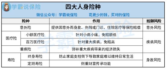 重疾险,医疗险,意外险,寿险被统称为四大人身险种,学姐认为都很重要,并无明显的优劣之分。