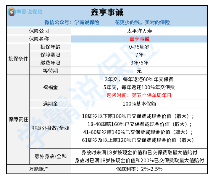 可以看到的是,鑫享事诚是一款保障7年的快返型保险,包含祝福金、满期金和身故保险金三项责任。下面一起来分析一下它有哪些优点吧。