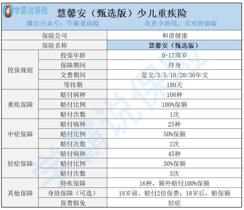1、慧馨安(甄选版)少儿重疾险的优点: