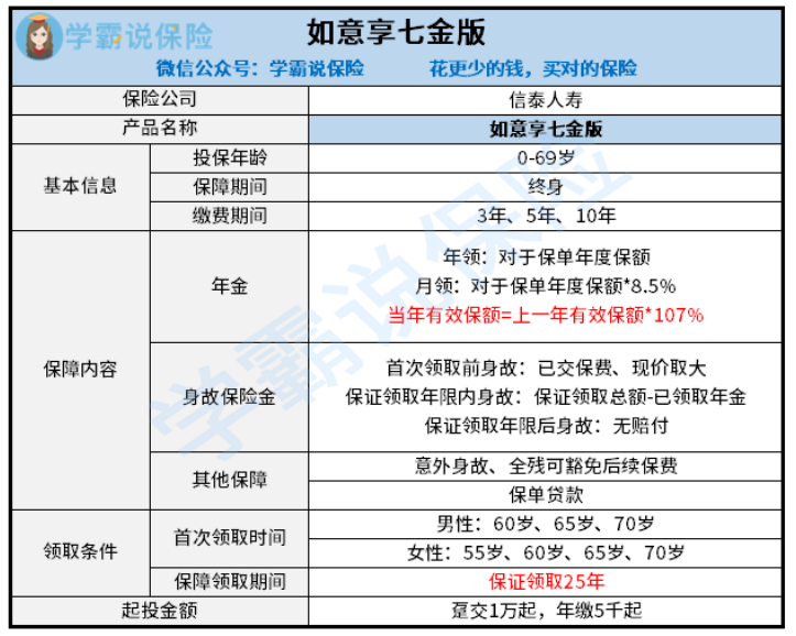 学姐这就带大家看看一款收益还不错的年金险——信泰如意享七金版。对年金险还懵懵懂懂的小伙伴别担心,这份攻略送给你: