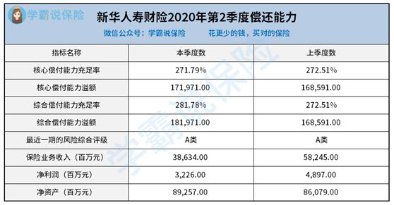 据监管机构发布的数据来看,新华人寿2020年第二季度综合偿付能力充足率达到了281.78%,风险综合评级为A级。可以看到它是具有不错的抗风险能力的。