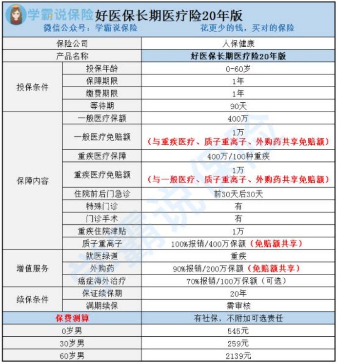 好医保长期医疗险20年版一般医疗保额400万,与重疾医疗、质子重离子、外购药共享1万免赔额。