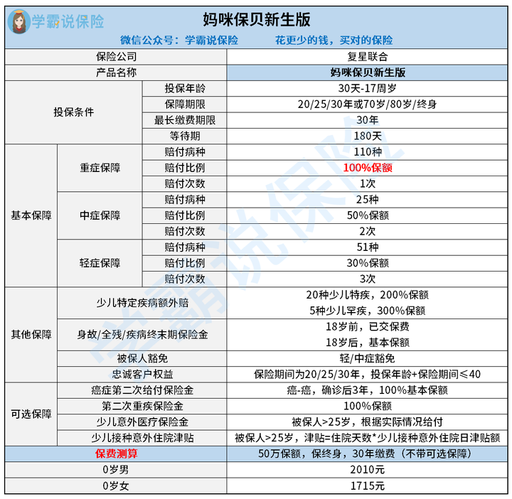 这款值得给孩子买的重疾险,是复星联合健康保险公司旗下的妈咪保贝新生版,话不多说,上图: