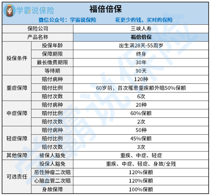 福倍倍保是一款保终身的重疾险产品,承保出生满28天-55周岁人群。基础保障包含了重疾、中症跟轻症,自带被保人豁免,可选择责任有4种:投保人豁免、恶性肿瘤二次赔、心脑血管二次赔跟身故保障。