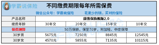 由表格可以看出,选择30年缴费和选择10年缴费的保费差距是非常明显的,相差了一倍。