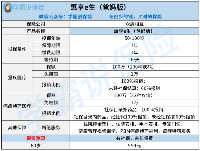 惠享e生(爸妈版)承保50-100岁人群,基本上为老年群体。