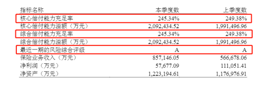 我们从上面中信保诚人寿的偿付能力披露数据截图可以看到,它的核心偿付能力充足率和综合偿付能力充足率都是245.34%,最新一期风险评级为A级。