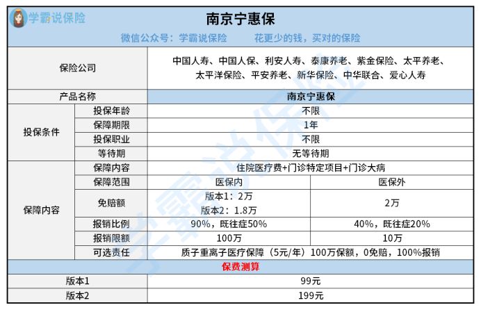 南京宁惠保一共有两个版本,版本一的保费为99元,版本2的保费为199元。一顿饭钱就可以买到一年的保障,还是很划算的。